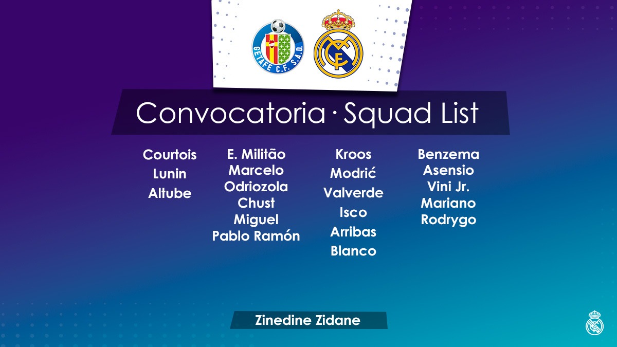 Zidane ha confirmado la lista con los jugadores que se enfrentarán mañana domingo al Getafe en el Coliseo Alfonso Pérez a las 21:00 horas (Movistar Partidazo y Audio de RMTV)