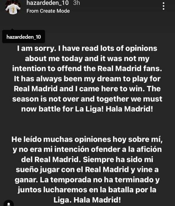 Pues bien, pasadas 24 horas de aquello, y ante la creciente oleada de críticas recibidas por el belga, Hazard ha sacado un comunicado en su cuenta de Instagram en el que se disculpa abiertamente por lo ocurrido.