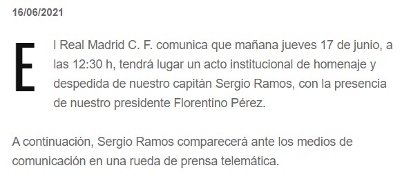 Así lo ha confirmado el propio Real Madrid, en un comunicado publicado a última hora del día de hoy y en el que, además, se informa de una comparecencia conjunta por parte de Sergio Ramos y el presidente del club, Florentino Pérez, donde se homenajeará en su despedida al hasta ahora capitán blanco, que finalizará con una rueda de prensa del jugador.