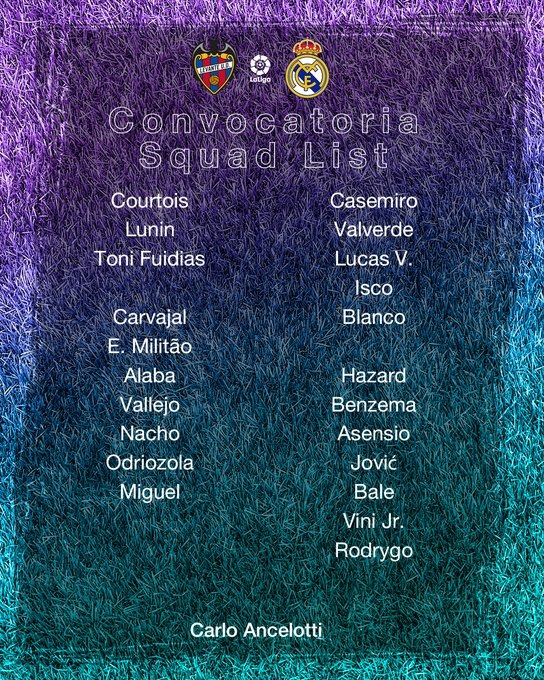 En la que ha supuesto su segunda convocatoria oficial como entrenador madridista, Carlo Ancelotti ha desvelado la lista de 22 jugadores que viajarán a Valencia para disputar el partido de Liga ante el Levante mañana domingo a las 22:00 horas (Movistar LaLiga y audio de RMTV).