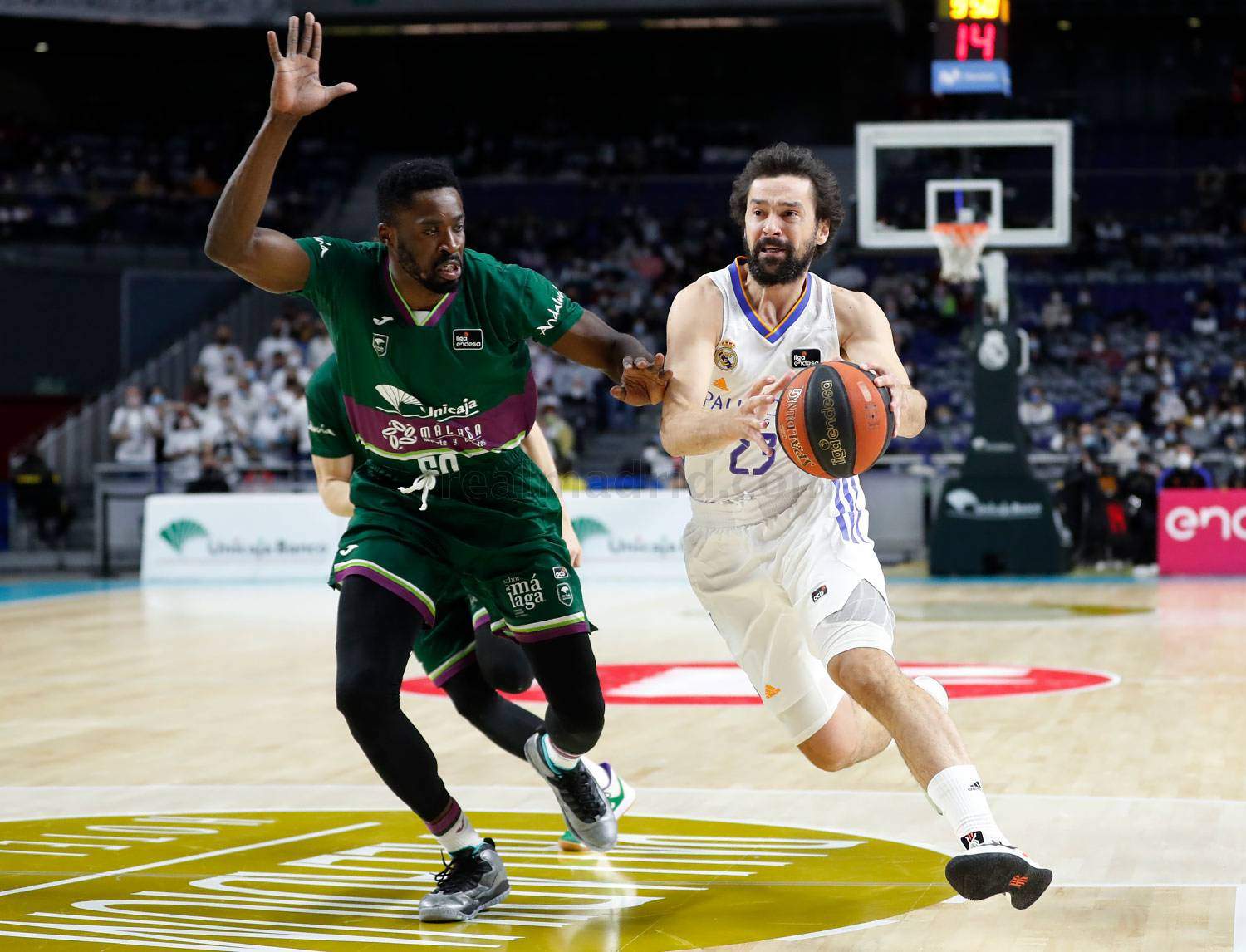 El Madrid reducía la diferencia pero Unicaja rápidamente estiraba el chicle en un intercambio de canastas de media distancia que los blancos no conseguían frenar. Laso se veía obligado a parar el partido con 31-35, pues las sensaciones en los suyos no eran nada buenas. Los blancos se mostraban desacertados, faltos de intensidad en la pintura, quizás fruto del cansancio excesivo realizado ante el Barcelona en Euroliga, pues no hacían uso del cupo de faltas para frenar a su rival. Tan sólo una falta en el segundo cuarto, que terminó con una canasta a falta de cuatro segundos de Eric y un Laso fuera de sí, abroncando a Hanga mientras encaraban el túnel de vestuarios con 31-37 en el electrónico.