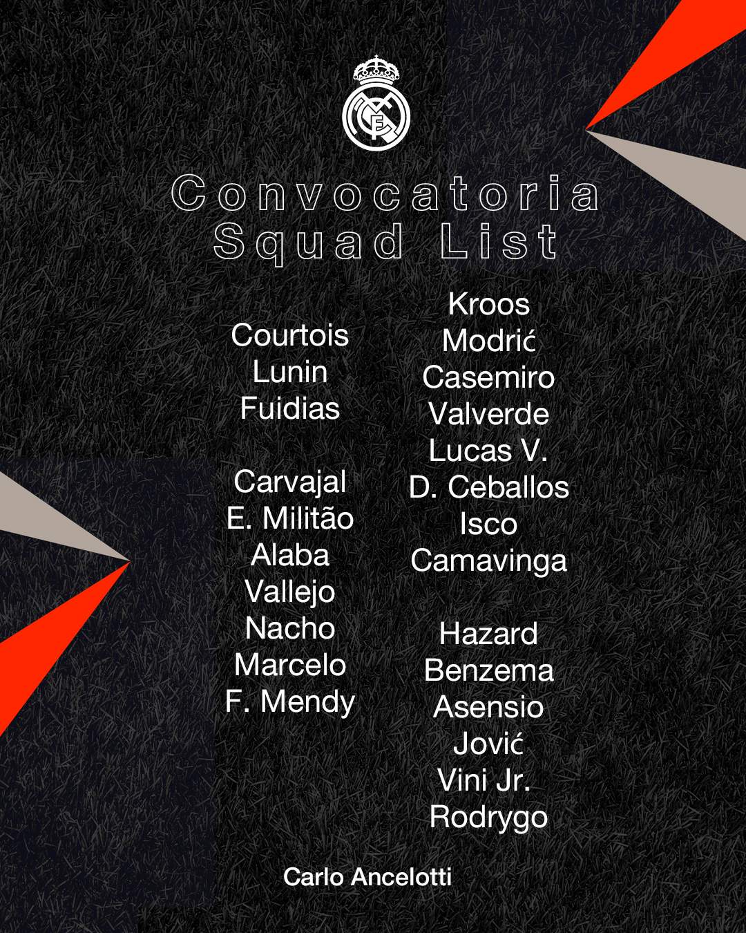 - Delanteros: Hazard, Vinicius, Benzema, Rodrygo, Asensio y Jovic.