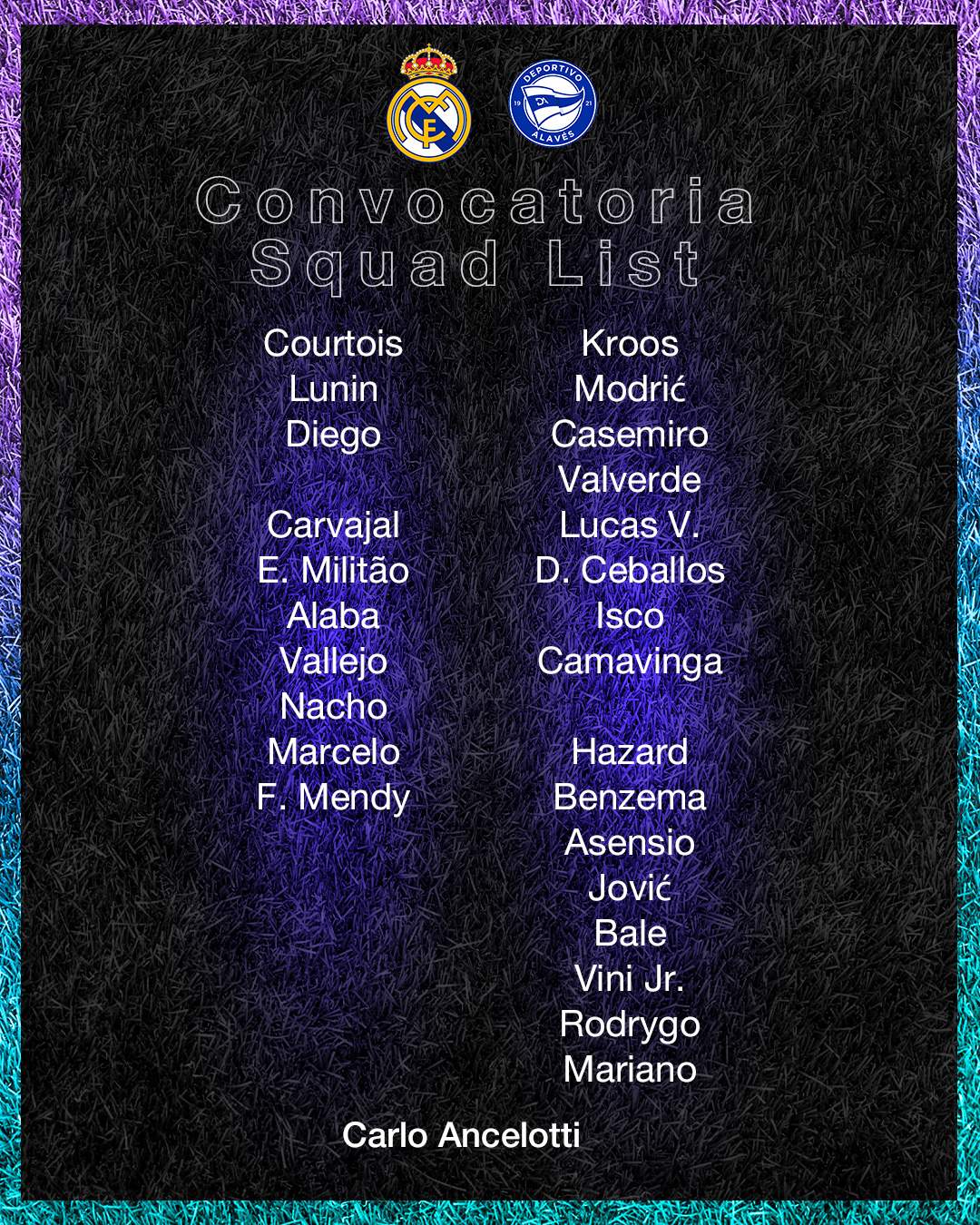 • Delanteros: Vinicius, Hazard, Benzema, Bale, Rodrygo, Asensio y Mariano.
