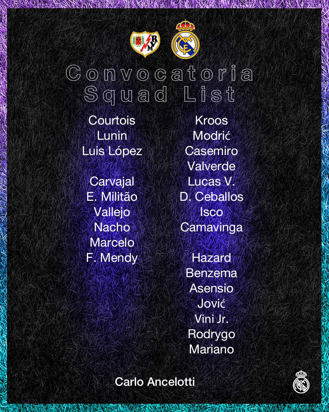 • Delanteros: Hazard, Vinicius, Benzema, Asensio, Rodrygo, Jovic y Mariano.