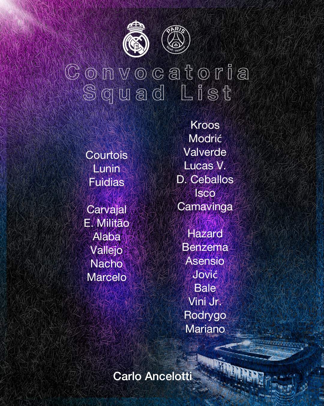 El Real Madrid ha confirmado la lista de 24 jugadores convocados para el trascendental partido de vuelta de octavos de final de Champions League ante el PSG, que se jugará mañana en el Santiago Bernabéu a partir de las 21:00 horas (Movistar Liga de Campeones y audio de RMTV).