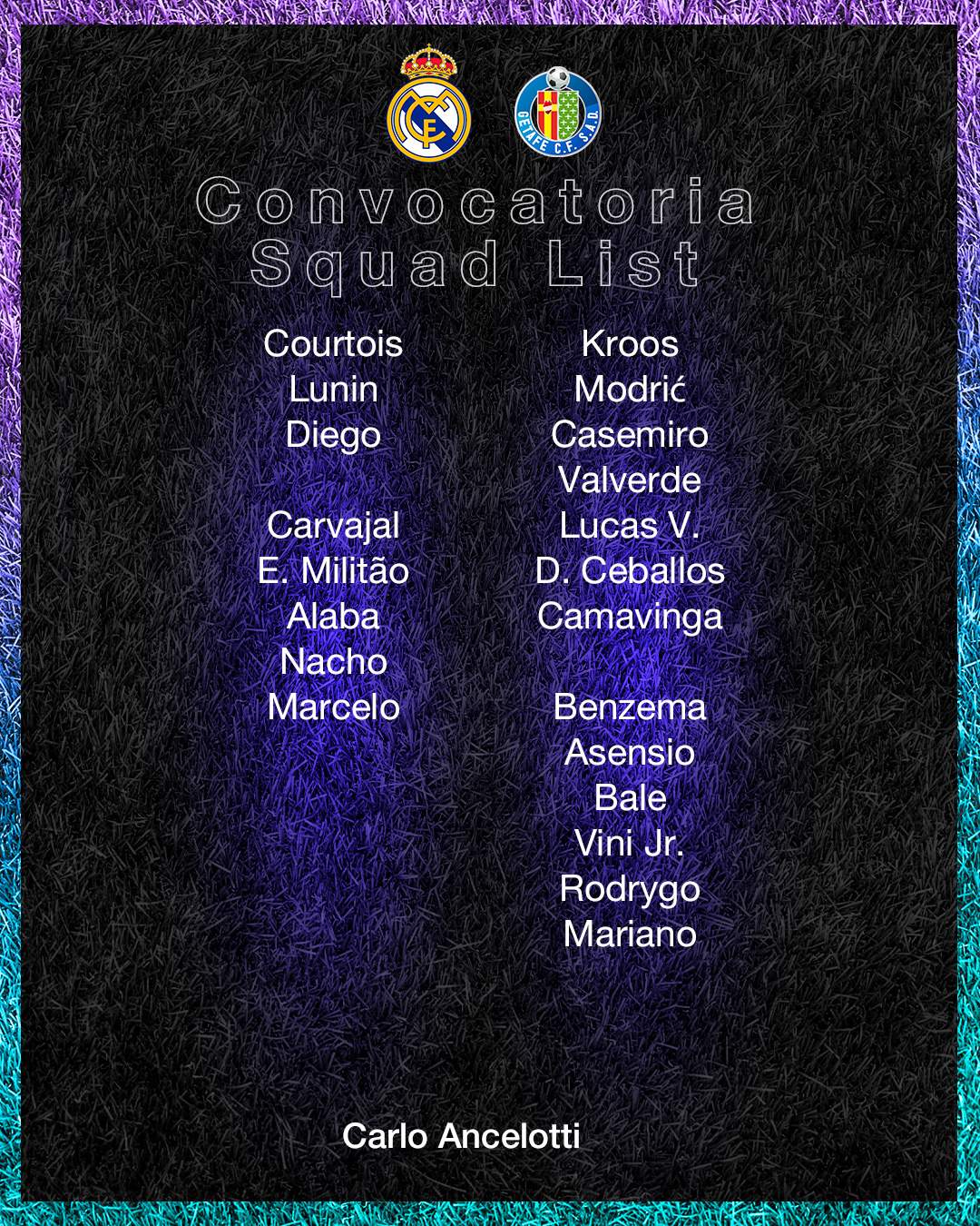 Con muchísimo retraso, a tan solo unas pocas horas del partido, el Real Madrid ha confirmado la lista de 21 jugadores que se enfrentarán esta noche al Getafe en el Estadio Santiago Bernabéu (21:00 horas, MovistarLaLiga y audio de RMTV).