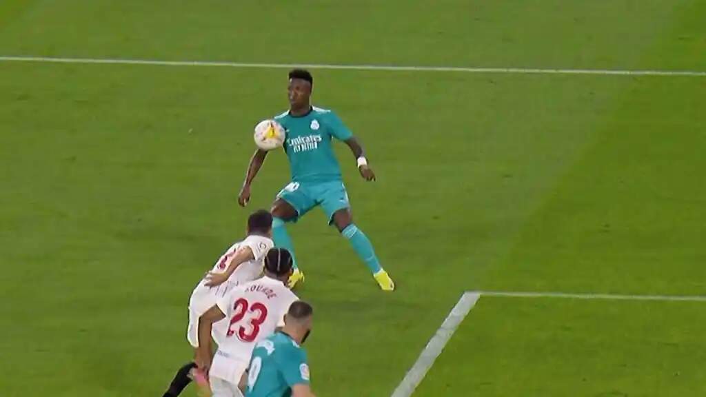 Pero acto seguido, llegó la jugada polémica del día y, muy probablemente, de la temporada. En el minuto 73, tras una larga jugada de ataque del Real Madrid, Lucas colgó un buen balón al área al que no llegó por poco Modric pero sí Vinicius quien, completamente solo, se acomodó el balón con el hombro, lo bajó al césped y remató cómodamente, batiendo por abajo a Bono.