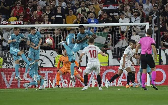 Y de lo que pudo haber sido el 0-1 se pasó en apenas dos minutos al 1-0. Fruto de esa especie de caraja inicial con la que salió el Madrid, y tras una falta de Modric en la frontal, llegó el primer tanto local. Una falta que Ivan Rakitic disparó sin demasiada intención pero Militao, de forma inexplicable, se apartó de la barrera provocando una vía de agua descomunal por la que se coló el balón del croata y así, en el minuto 20, el Sevilla se adelantaba en el marcador.