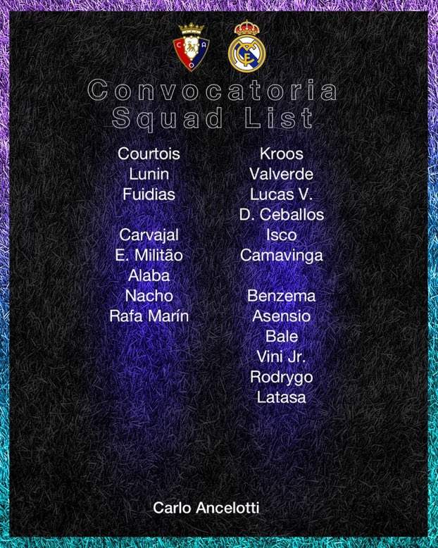 - Delanteros: Benzema, Vinicius, Rodrygo, Asensio, Bale, Mariano y Latasa.