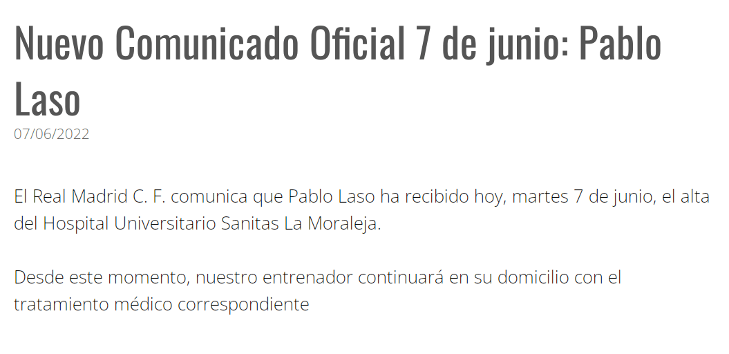 Así lo han confirmado tanto el Real Madrid, por medio de un comunicado hecho público en sus redes sociales y en la web del club, como el propio Laso, quien ha publicado un par de tuits, uno en el que informaba de que se iba a casa y otro en el que agradecía a todos la ingente catarata recibida de buenos deseos por parte de fans y profesionales del basket, así como la labor de los médicos que le han atendido desde la madrugada del sábado al domingo en dicho centro.