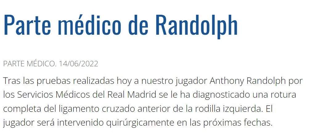 Pues bien, ya en Madrid y tras las pertintentes pruebas a las que fue sometido, Randolph sufre la rotura completa del ligamento cruzado anterior de la rodilla izquierda, según reza en el parte médico hecho público por el club. Una lesión que, además de obligarle a pasar por el quirófano, algo que se producirá en próximas fechas, le mantendrá apartado de las canchas entre seis y ocho meses.
