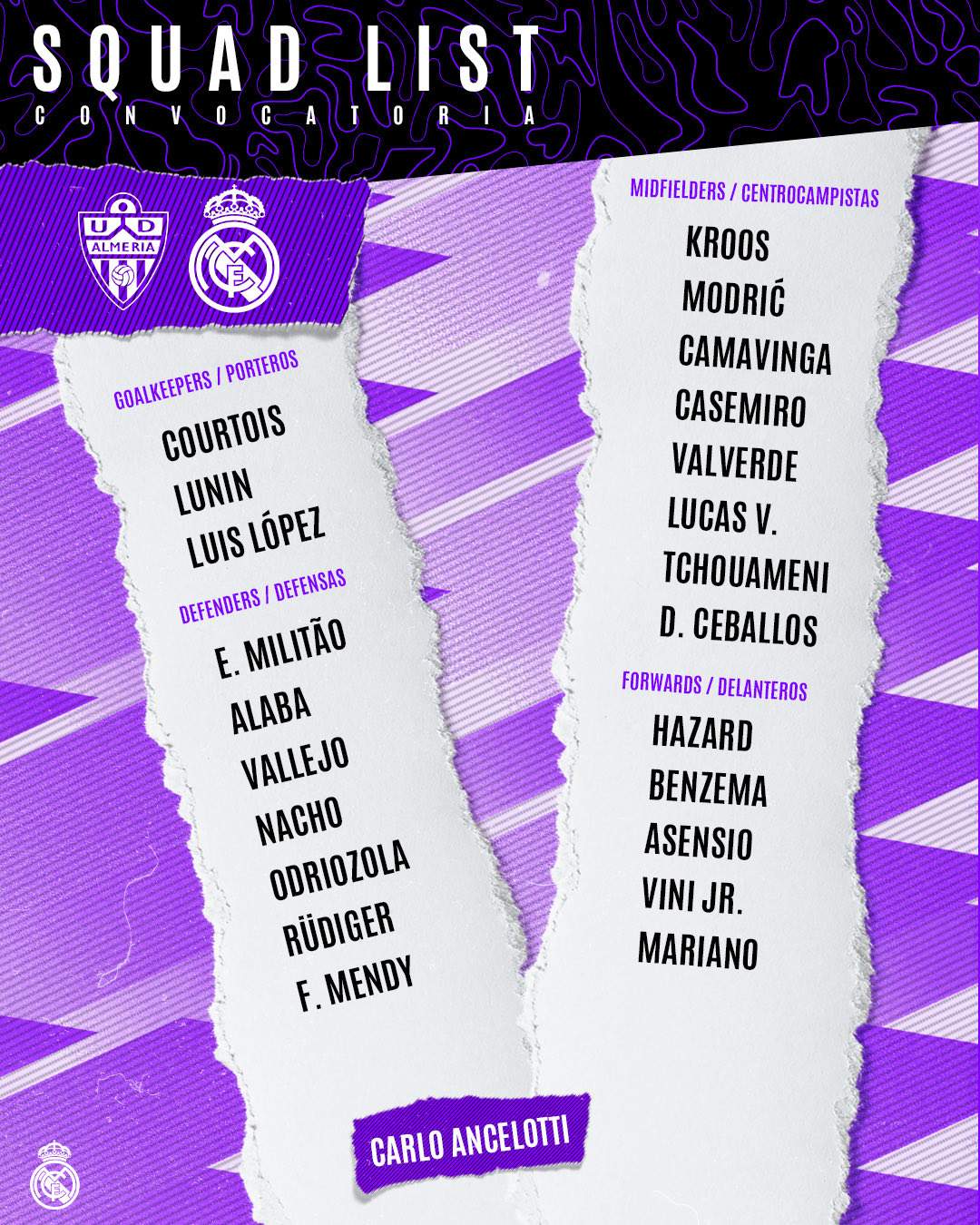 - Centrocampistas: Casemiro, Kroos, Modric, Fede Valverde, Camavinga. Tchouameni, Lucas Vázquez y Ceballos.