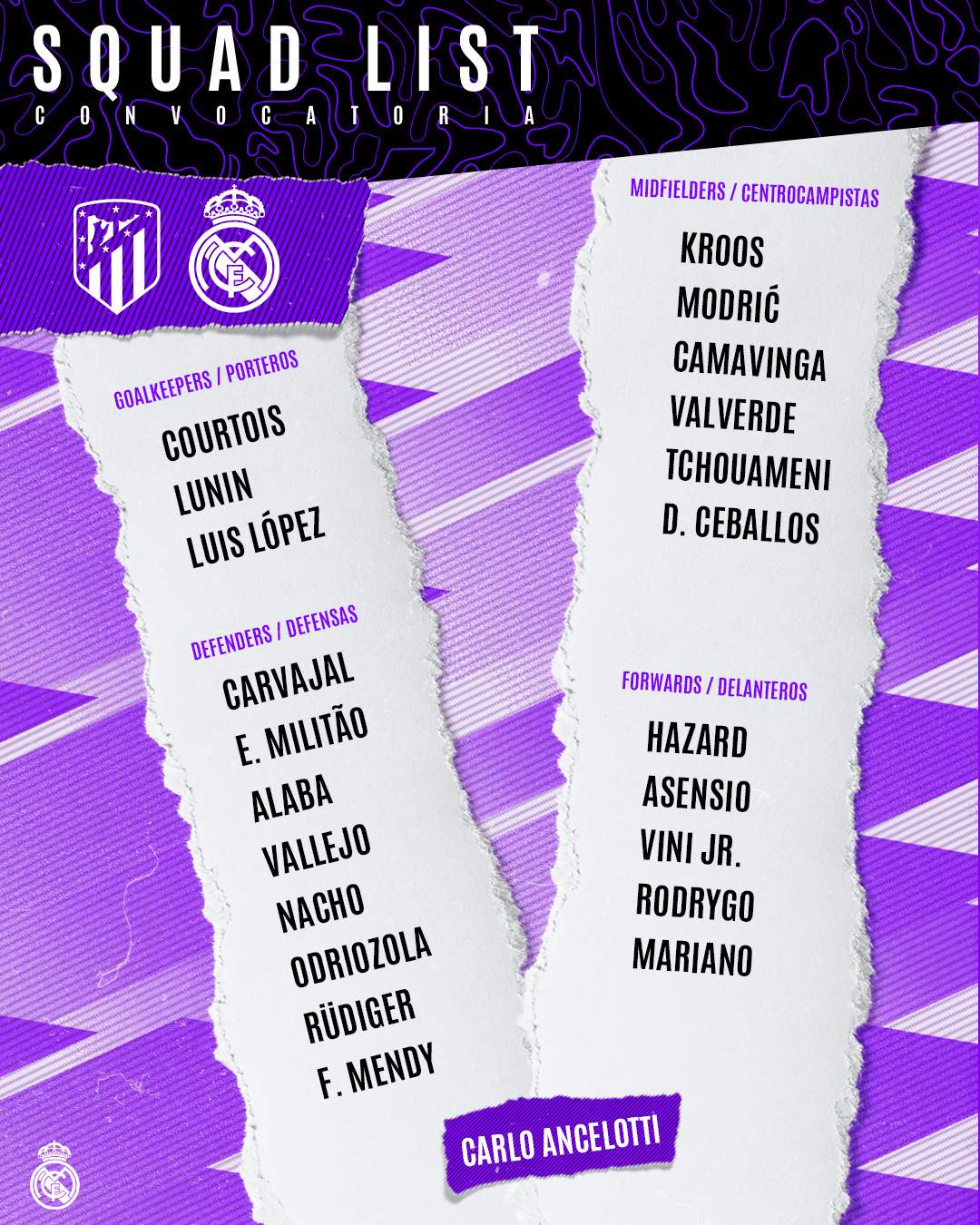 Carlo Ancelotti ha confirmado la lista de 22 jugadores que estarán en el Civitas Metropolitano este domingo a las 21:00 horas (DAZN La Liga, sin audio de RMTV) para la disputa ante el Atlético de Madrid del primer derbi madrileño de la temporada.