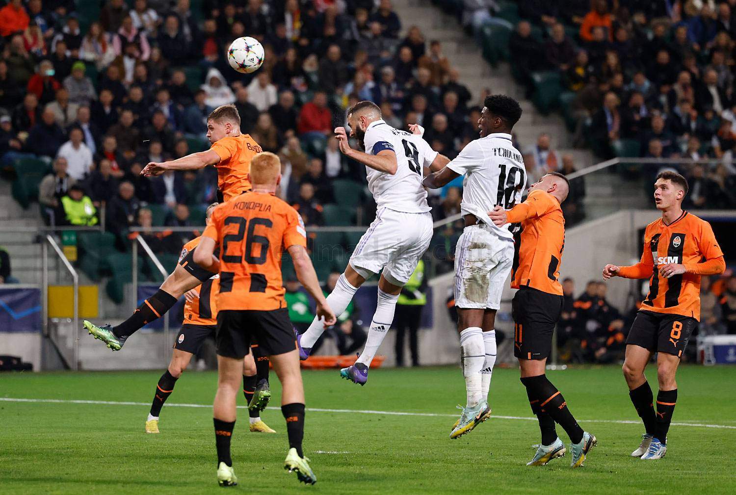 El cansancio de Mudryk, su mejor hombre y el empuje madridista acabaron por arrinconar al Shakhtar, que se defendía como gato panza arriba del ataque blanco pero la pelota no entraba.