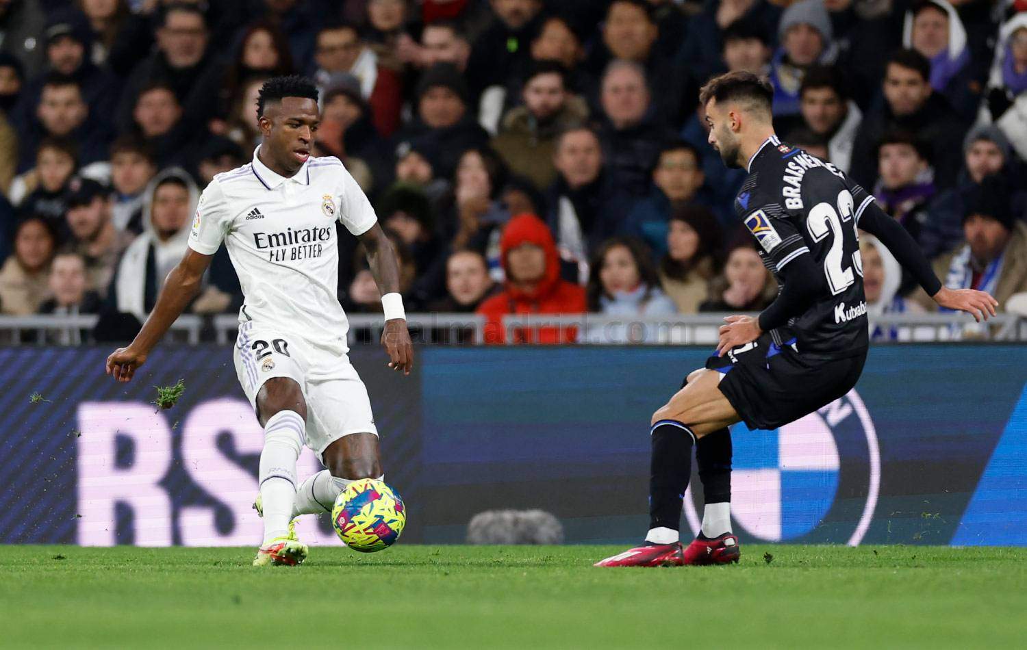 Aquello fue el preludio de la que, sin duda, fue la mejor ocasión del Real Madrid en todo el partido. En el minuto 71, un enrachado Vinicius, al que le salían casi todos los regates en la frontal, se plantó solo ante Remiro y en vez de intentarlo por abajo como en las otras ocasiones anteriores, optó por picar el balón por encima del portero vasco. Sin embargo, Remiro sacó una mano prodigiosa para desviar in extremis el balón a córner.