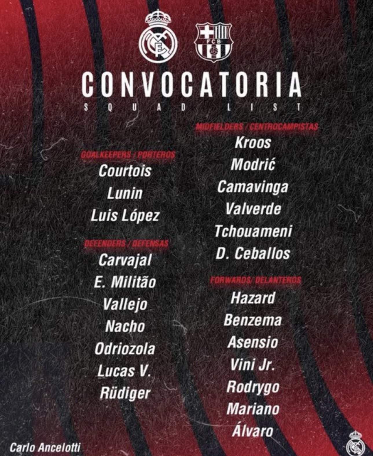 - Delanteros: Benzema, Vinicius, Rodrygo, Asensio, Hazard, Mariano y Alvaro.