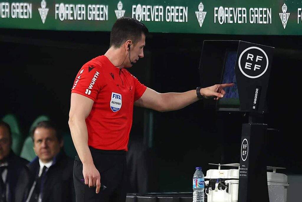 Pezzella debió haber sido expulsado por varias entradas a Vinicius, especialmente una casi al final del partido que se saldó sin ni siquiera señalar la infracción. Y también se tragó una salvaje agresión de Ruibal a Camavinga, sin que ni el colegiado ni el VAR, que es lo más grave, sancionase con una tarjeta roja dicha acción.