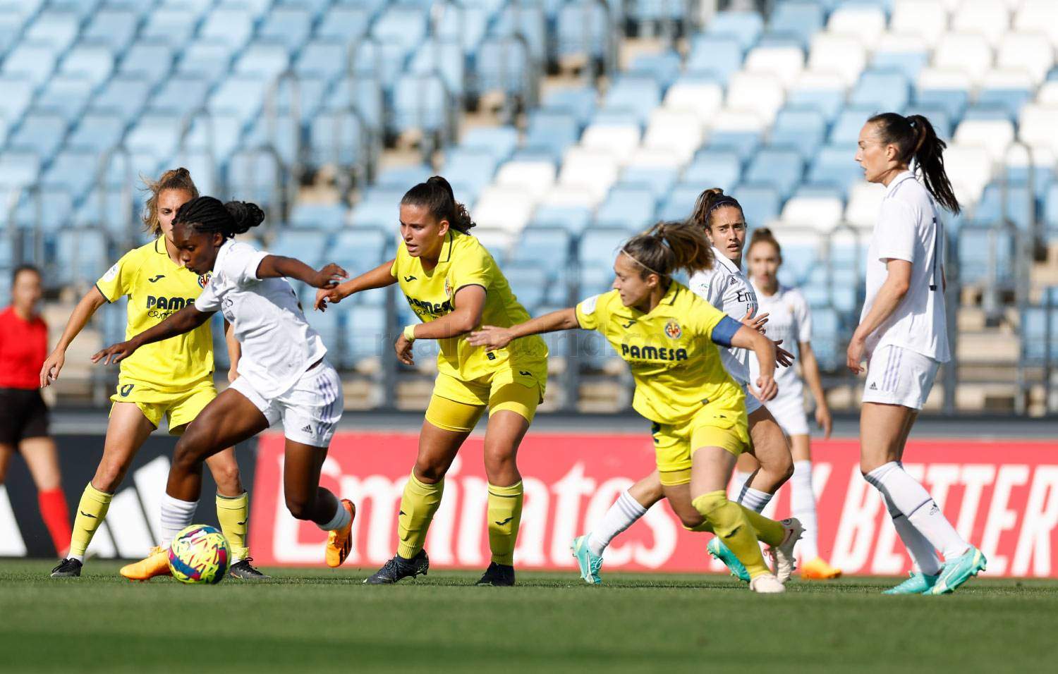 A partir de ese momento, el Real Madrid se vino arriba buscando un empate que, a pesar del dominio blanco, no llegaba porque la defensa amarilla se le estaba atravesando a las chicas de Toril, incapaces de dar con la tecla. Dominio intenso, sí pero sin apenas crear peligro en la primera mitad, hasta que apareció Weir.