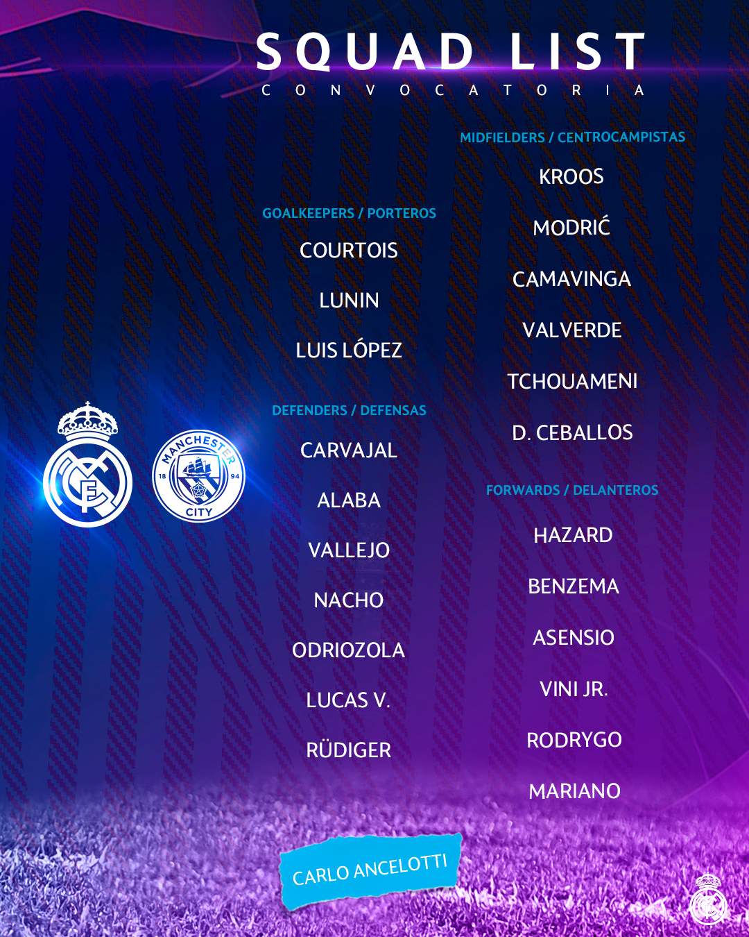 Carlo Ancelotti ha desvelado la lista con los 22 jugadores que integrarán la convocatoria para el partido de ida de semifinales de Champions League que enfrentará al Real Madrid y al Manchester City este martes en el Santiago Berrnabéu (21:00, Movistar Liga de Campeones y audio de RMTV).