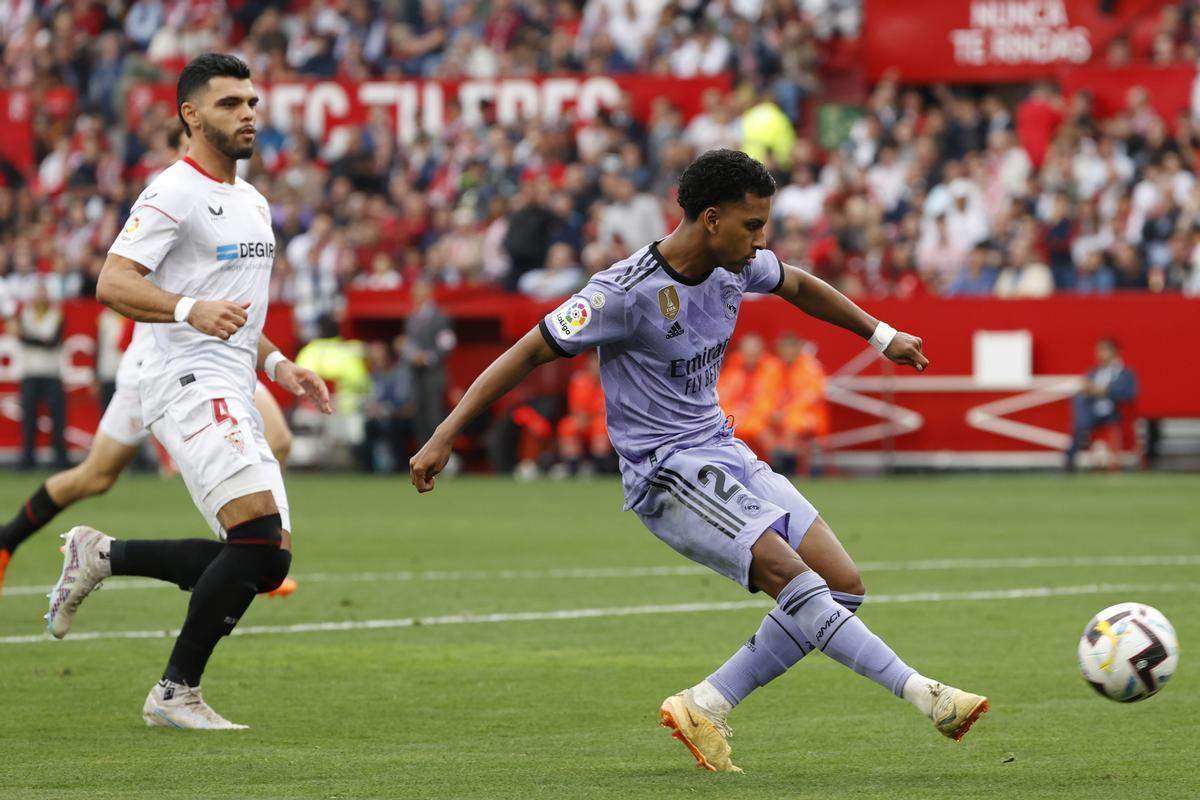 Seguramente la idea de Ancelotti era la de crear superioridades en el centro del campo y buscar a Rodrygo en los espacios, pero ese planteamiento no tardó ni tres minutos en írsele al garete al italiano. Los que tardó el Sevilla en ponerse por delante en el marcador.