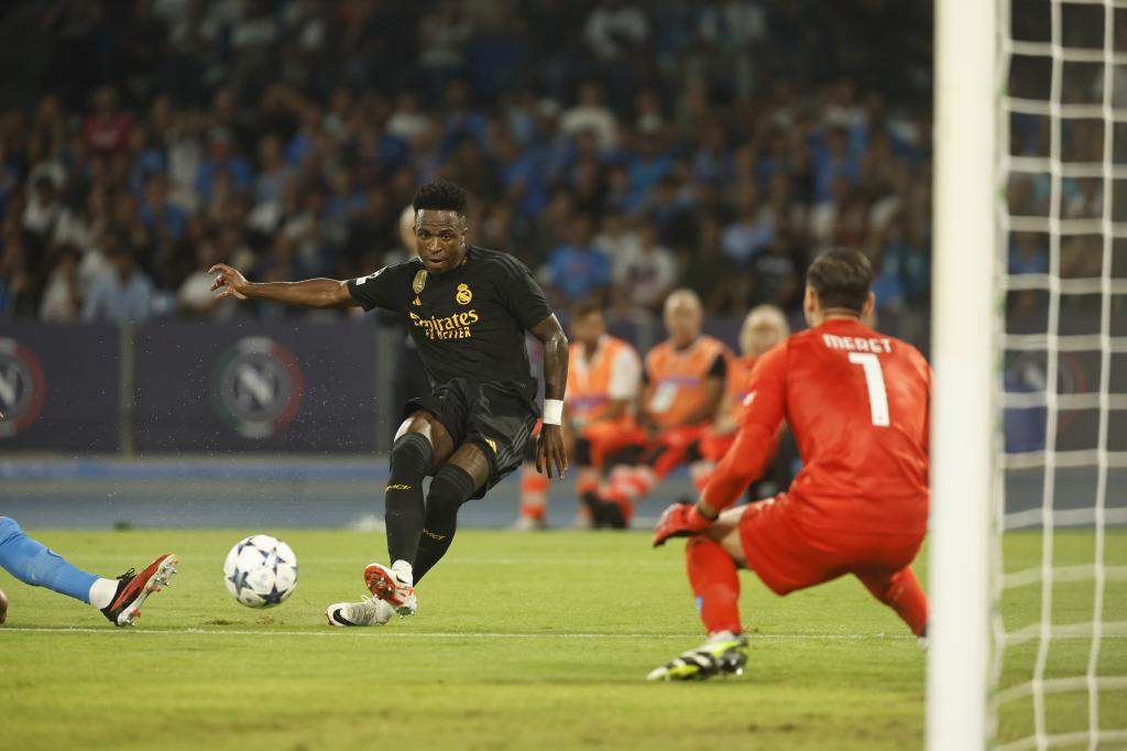 El Real Madrid comenzó en plan dominador y tremendamente activo en campo napolitano y avisó muy pronto de sus intenciones. A los cinco minutos, un buen servicio de Bellingham por la derecha hacia la espalda de la defensa habilitó a Rodrygo. El brasileño, rápido en el desmarque no lo fue tanto en la ejecución y falló en el mano a mano, estrellando el balón contra el cuerpo de Meret.