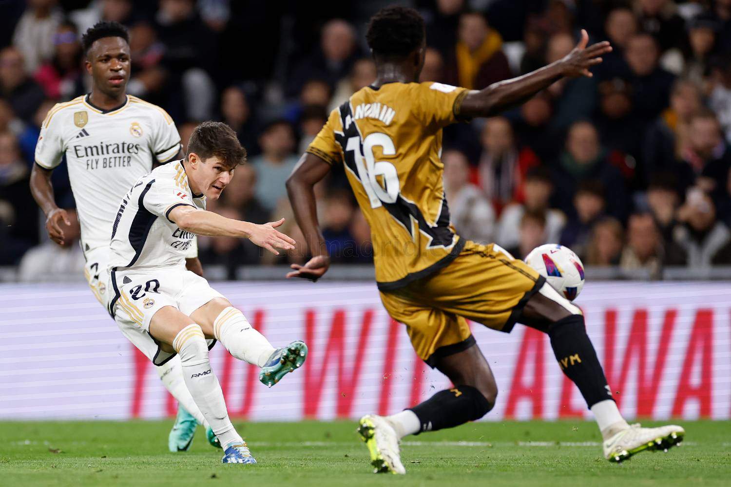 Luego, poco a poco Vinicius se fue desquiciando hasta acabar amonestado por una sonora protesta después de que el colegiado alicantino dejase sin sancionar dos claras faltas del Rayo sobre Camavinga y acabase señalando infracción al jugador francés.