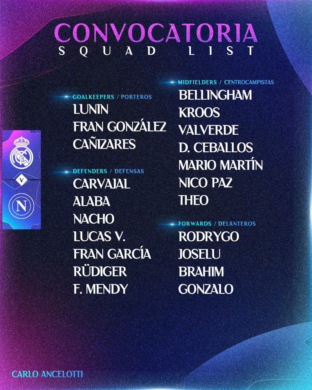 - Centrocampistas: , Kroos, Fede Valverde, Ceballos, Bellingham, Mario Martín, Nico Paz y Theo Zidane.