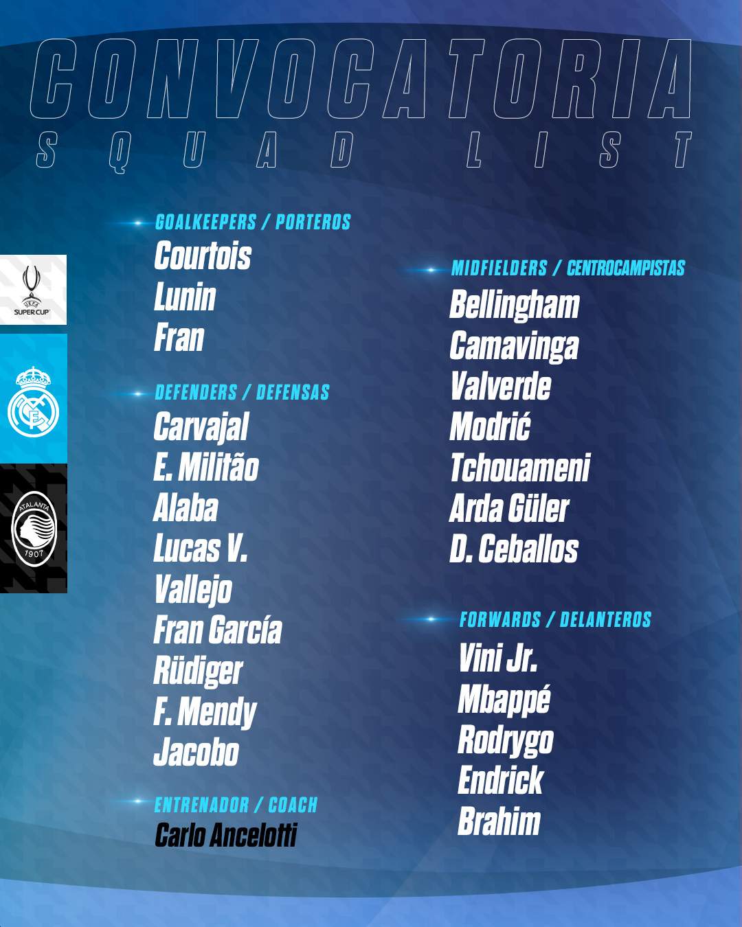 El Real Madrid ha hecho pública su primera lista oficial de convocados de la temporada para disputar la Supercopa de Europa, que le enfrentará al Atalanta a las 21:00 horas en el Estadio Nacional de Varsovia (Movistar Plus+ y audio de RMTV)