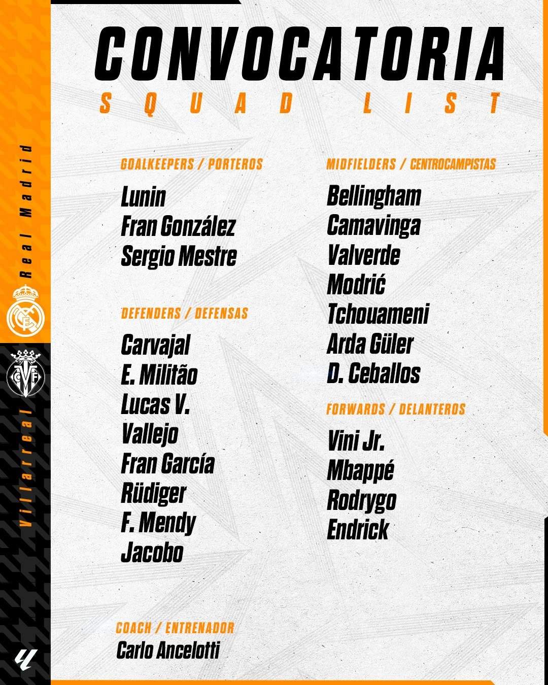 • Defensas: Carvajal, Lucas Vázquez, Militao, Rüdiger, Vallejo, Jacobo Ramón, Mendy y Fran García.