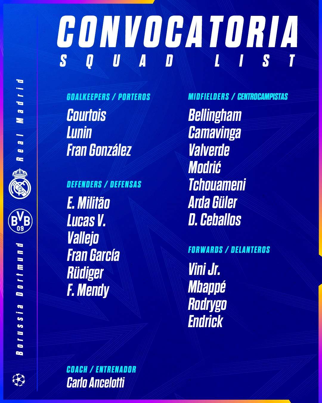 El Real Madrid ha anunciado la lista con los 20 jugadores que integran la convocatoria del equipo para el tercer partido de la Fase de Grupos de la Champions League, que enfrentará al club blanco con el Borussia Dortmund en el Estadio Santiago Bernabéu este martes a las 21:00 horas (Movistar Liga de Campeones y audio de RMTV).