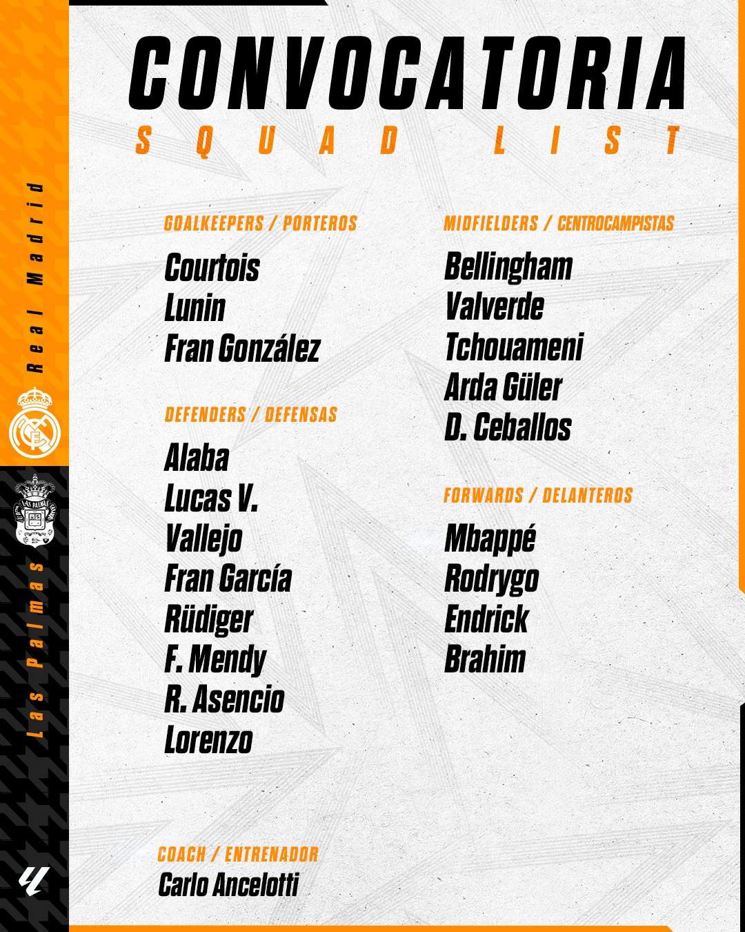 Carlo Ancelotti ha hecho pública la lista con los 20 jugadores convocados para el partido ante la UD Las Palmas, correspondiente a la 20ª jornada de la Liga EA Sports y que se jugará este domingo en el Santiago Bernabéu (16:30 horas, DAZN).