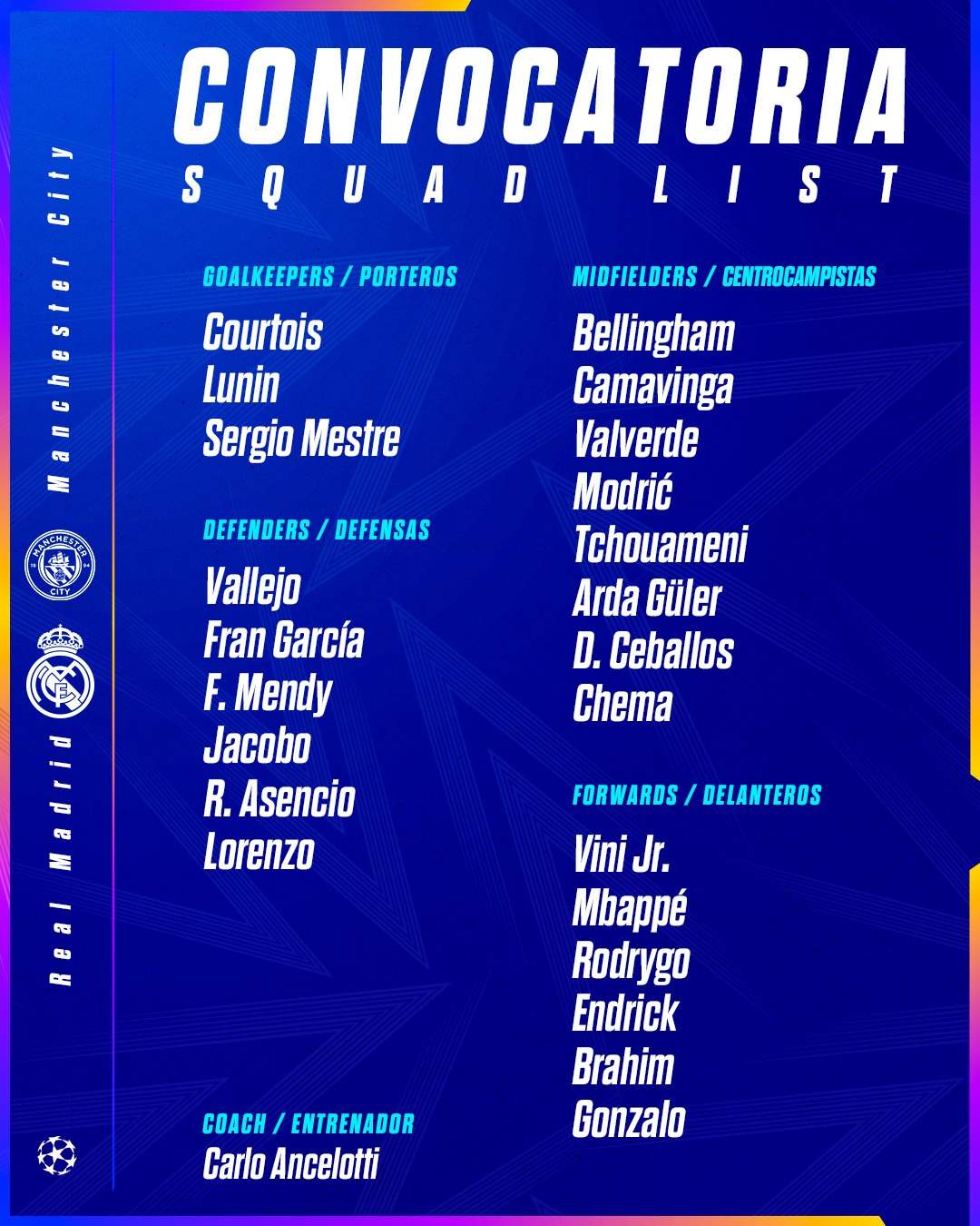 El Real Madrid ha confirmado la lista con la convocatoria para el partido de este martes, 11 de febrero, en el Etihad Stadium entre el Manchester City y el Real Madrid (21:00 horas, Movistar Liga de Campeones y audio de RMTV), en partido de ida de la repesca para la fase de octavos de final de la Champions League.