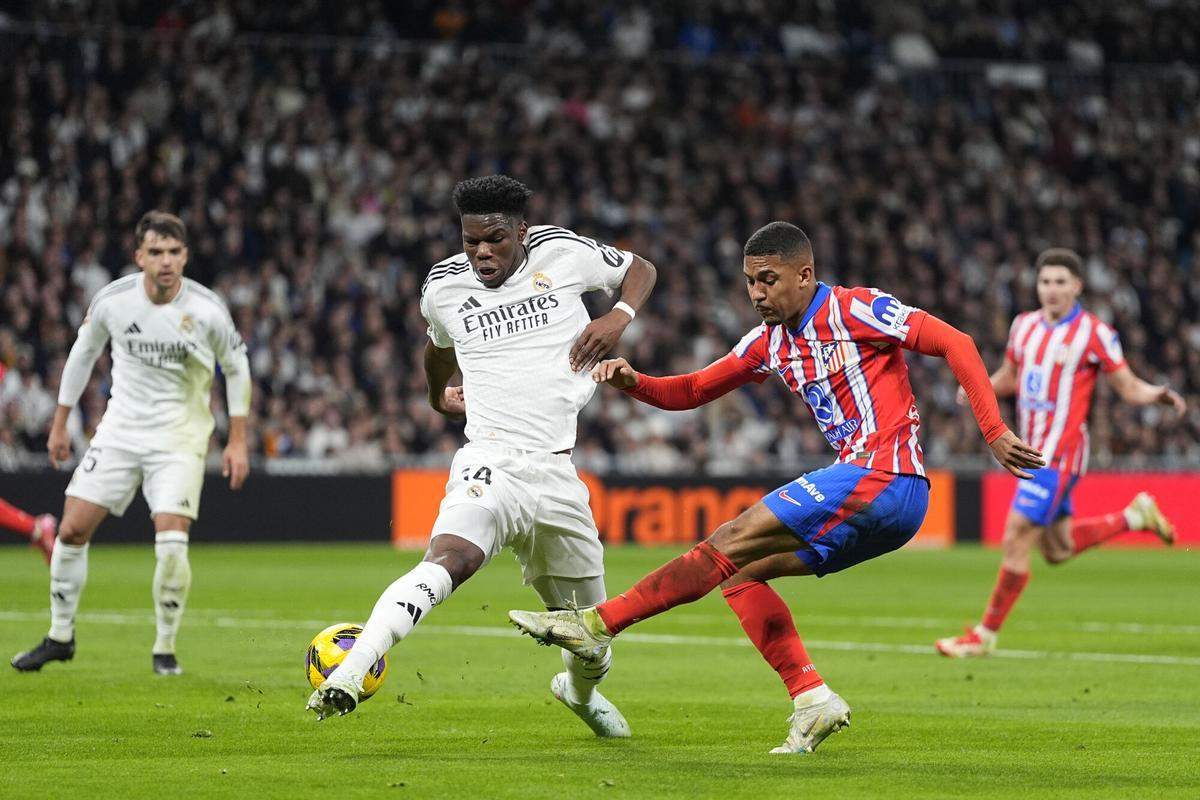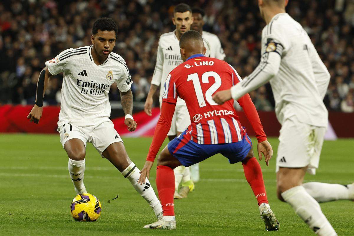 Los primeros minutos fueron de dominio madridista pero sin profundidad. Con la variante táctica de poner Vinicius más hacia el centro, jugando entre líneas y dejando a Mbappé la banda izquierda, el Real Madrid tocaba y tocaba pero sin apenas forma de hincarle el diente al entramado defensivo planteado por el Cholo, por más que Rodrygo -el mejor de los de blanco en el partido- lo intentase todo, haciendo sufrir de lo lindo a Javi Galán.