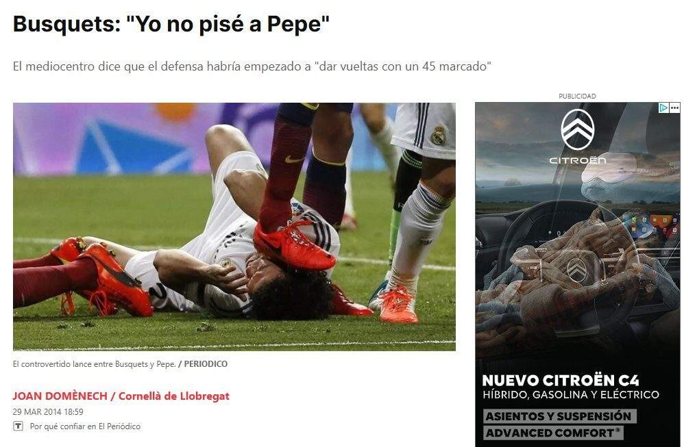 Esta vez no hubo victimismo pero sí recochineo porque, además, la víctima era Pepe, enemigo público junto a CR7 del Barcelonismo y, por tanto, bien pisado estuvo. Es más, no sólo Busquets no fue sancionado por aquello sino que encima tuvimos que aguantar al genuflexo Marqués del Rencor, Don Vicente del Bosque, sacar la cara por el centrocampista culé, al que definió como «un gran chico» y un modelo para él.