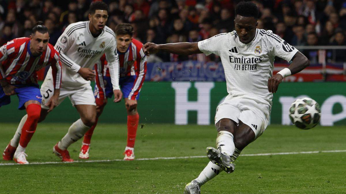 Quizás pudo y debió recibir más sanción el jugador del Atlético de Madrid, que sólo vio la amarilla a pesar de ser el último hombre y desentenderse del balón para trabar a Mbappé, pero el caso es que, sin apenas discusión, Vinicius se aprestó a lanzar el penalti.