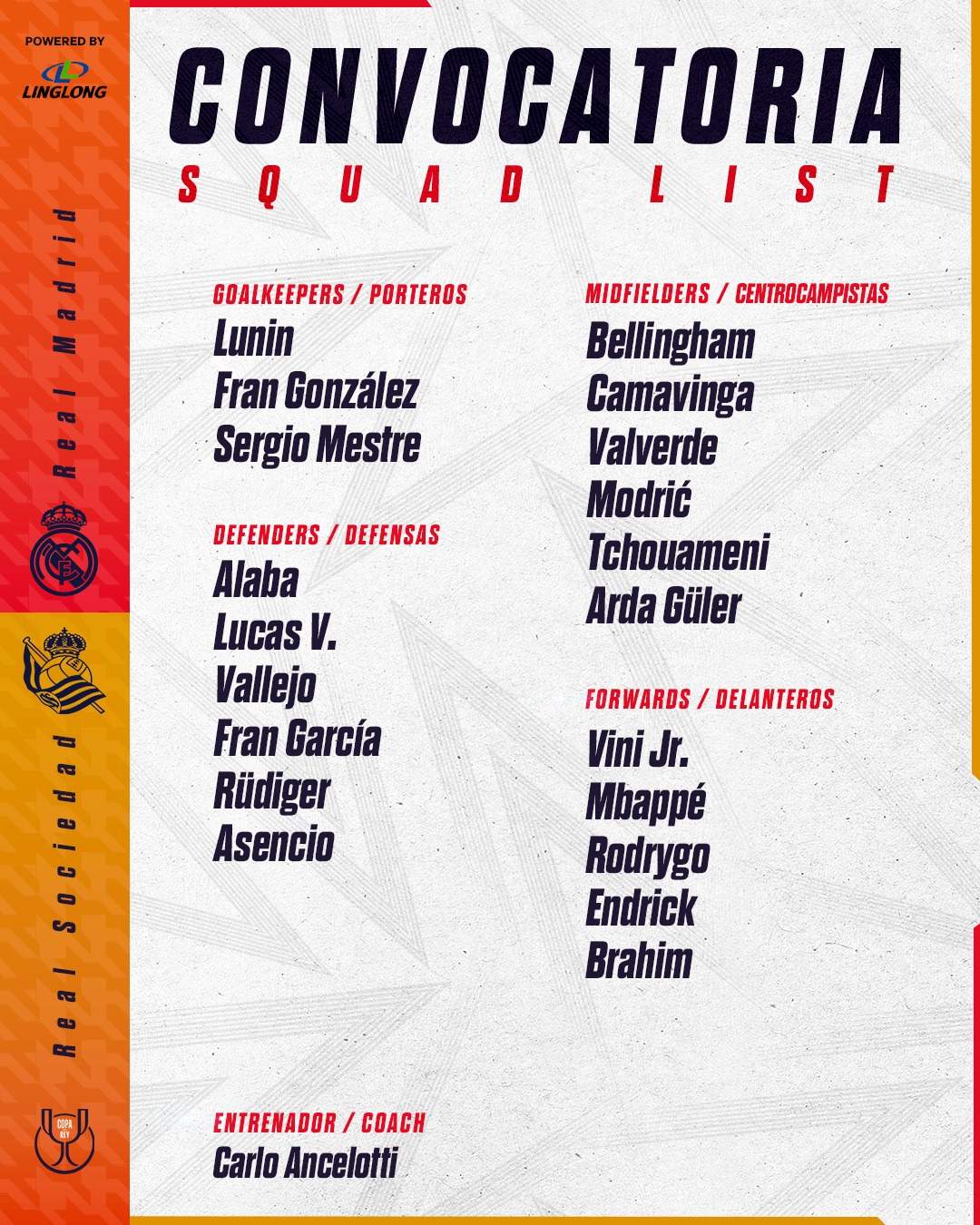El Real Madrid ha confirmado la lista de convocados para el partido de vuelta de semifinales de Copa del Rey ante la Real Sociedad, que se disputará este martes en el Santiago Bernabéu (21:30, TVE 1).