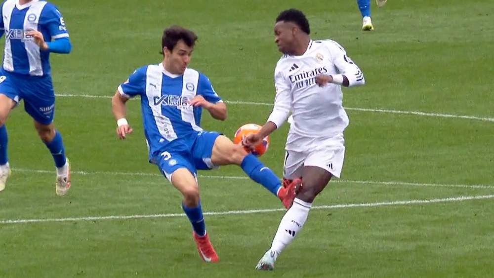 Sin embargo, sorprendentemente, Soto Grado dejó seguir la jugada y dijo que ahí no había pasado nada, a pesar de los ostensibles gestos de dolor del brasileño. Entonces, pasados unos instantes, el colegiado riojano fue llamado de nuevo desde el VAR para revisar la acción y se encontró con un plantillazo descomunal de Manu Sánchez sobre la parte trasera de la rodilla y el gemelo de Vinicius, como mínimo igual de peligroso que el de Mbappé minutos antes.