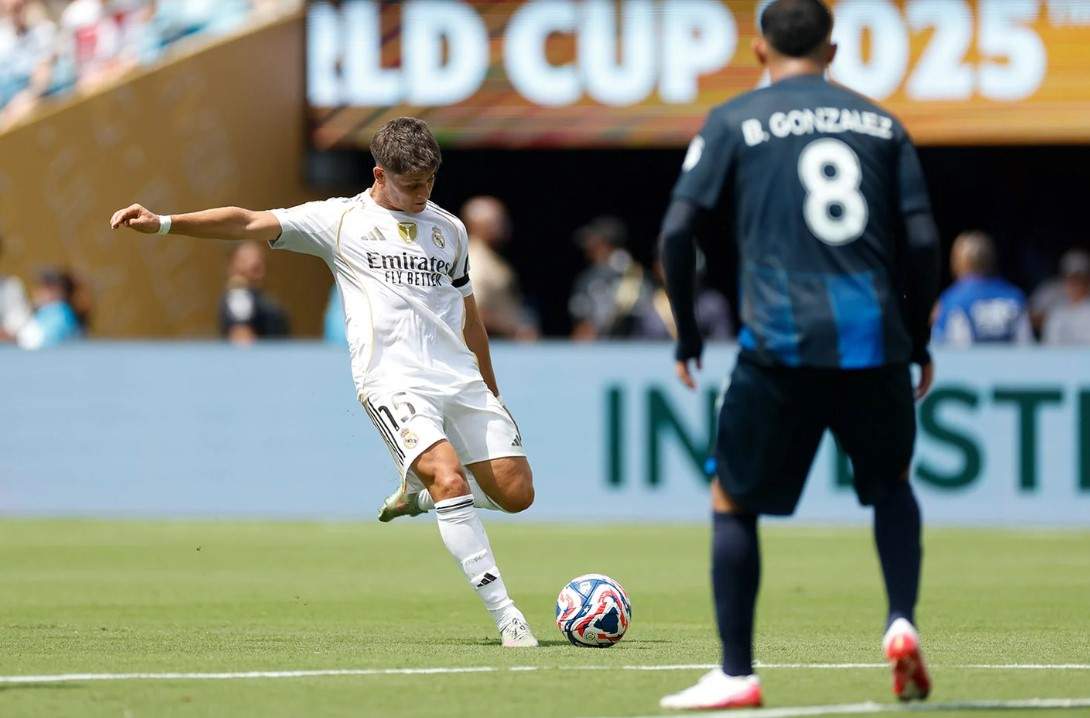 El Real Madrid salió de inicio con un planteamiento diferente, con un 4-4-2, con la misma defensa que ante el Al Hilal, es decir, Alexander-Arnold, Asencio, Huijsen y Fran García pero con Tchouameni como pivote, acompañado en el eje por Güler y con Valverde y Bellingham, más escorados a la banda, mientras que delante repetían Vinicius y Gonzalo como atacantes.