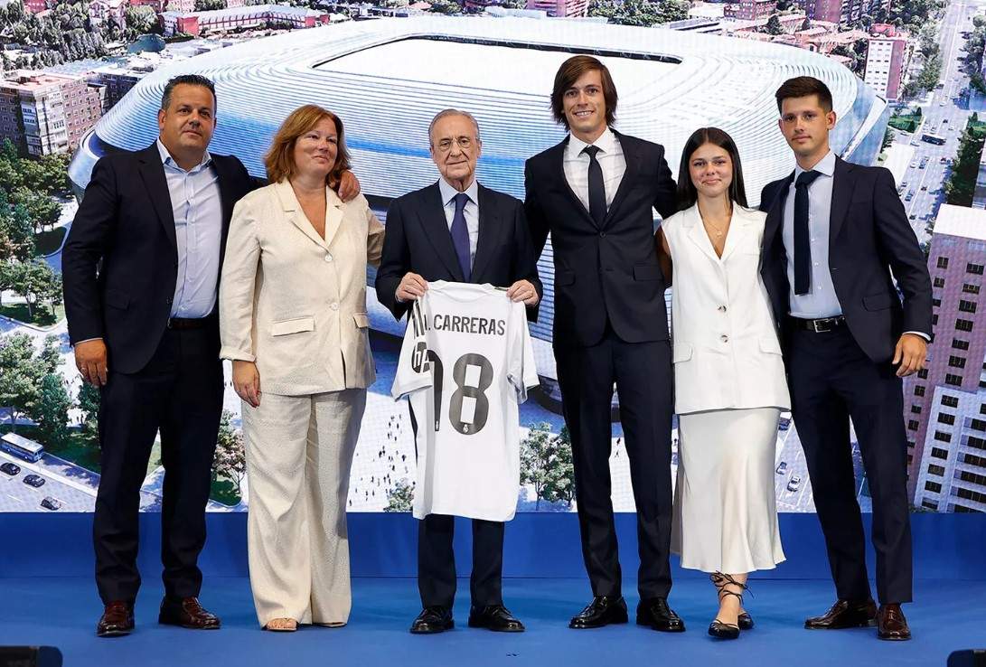 Finalizados los discursos, Florentino Pérez y Carreras posaron junto a la familia del jugador, justo antes de dirigirse a la esperada rueda de prensa.