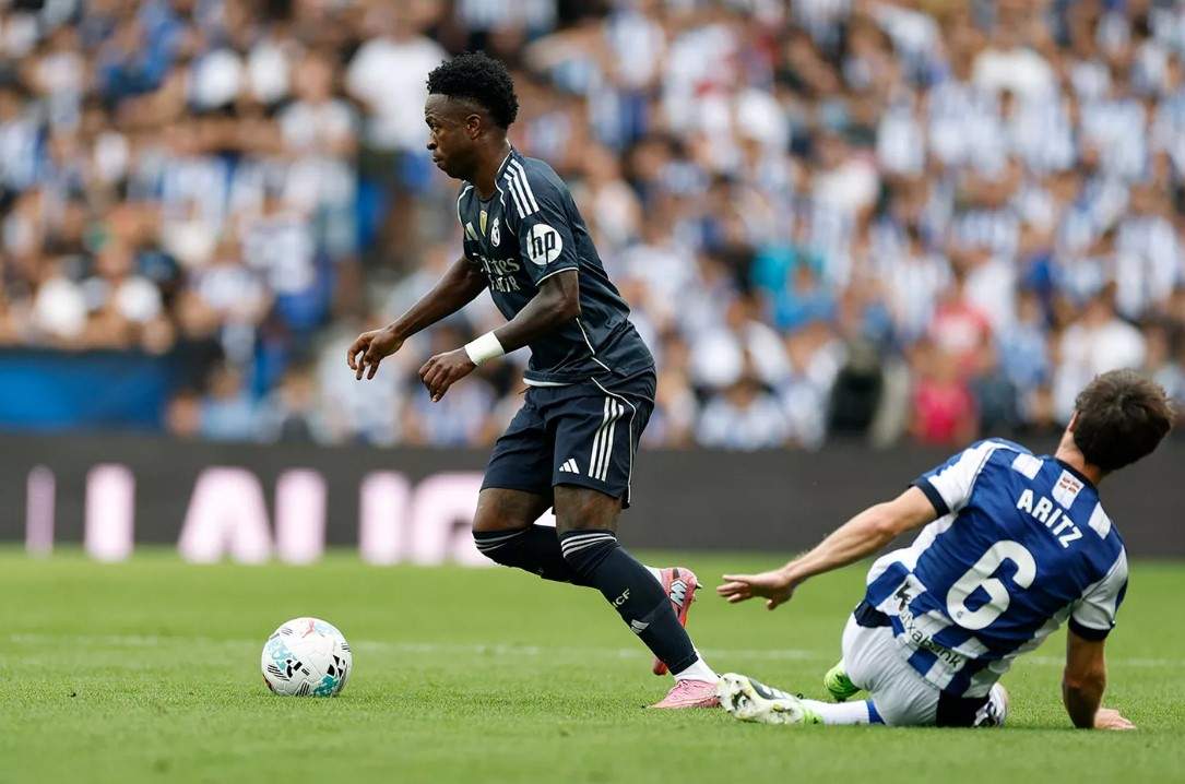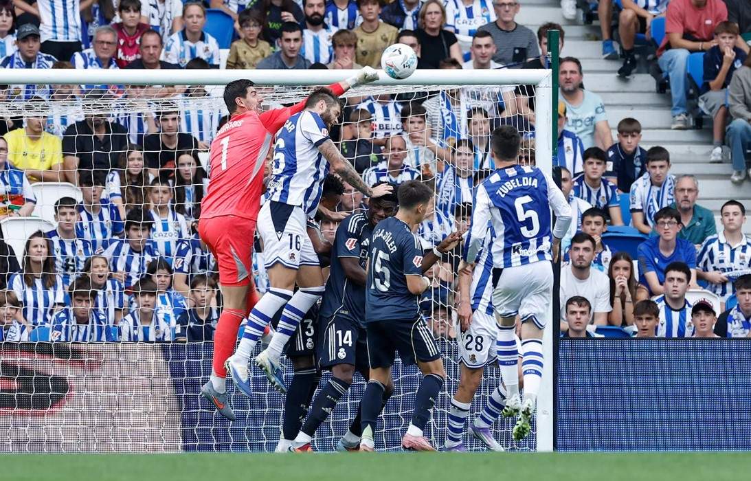 La segunda mitad comenzó con otra nueva ocasión madridista a los cuatro minutos a cargo de Vinicius, hasta ese momento, desaparecido, pero su disparo acabó demasiado ajustado al palo izquierdo. Y lo que son las cosas, del posible 0-3 se pudo pasar al 1-2 porque en la jugada siguiente, la Real pudo acortar distancias.