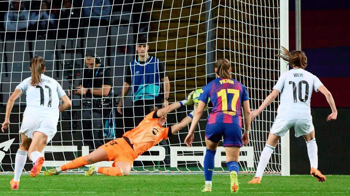 Pudo acortar distancias el Real Madrid apenas tres minutos después cuando Irene Paredes sacó bajo palos un disparo de Weir tras otra buena galopada de Linda Caicedo, pero no era el día.