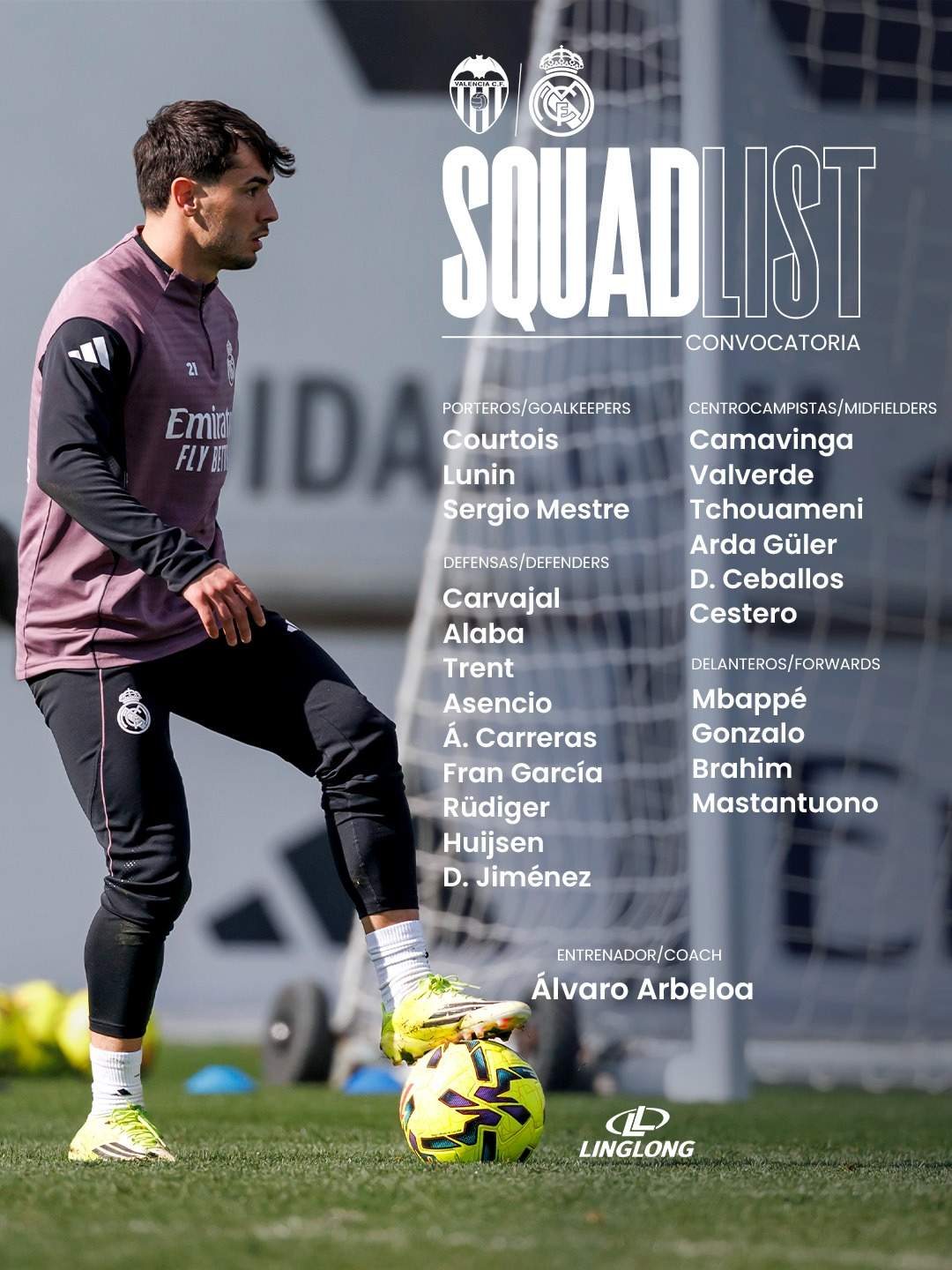 - Defensas: Carvajal, Alexander-Arnold, Rüdiger, Asencio, Huijsen, Alaba, Carreras, Fran García y David Jiménez.