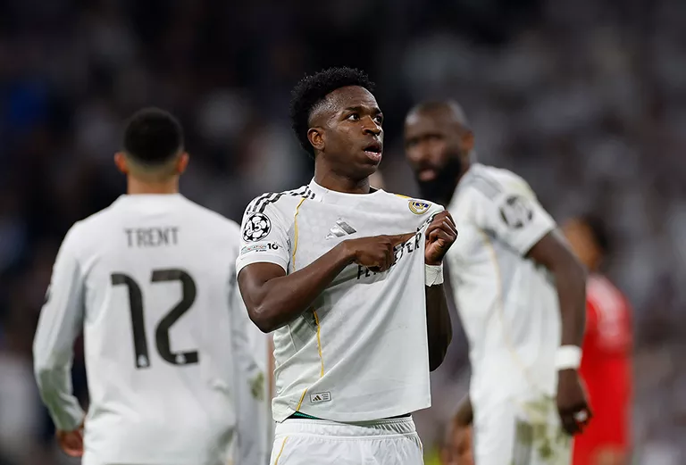 Vinicius señalándose el escudo tras marcar el segundo gol madridista | Real Madrid 2-1 Benfica