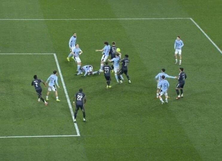 Respondió rápidamente el Real Madrid, gracias a una gran jugada de Vinicius, quien ganó por velocidad a la defensa tras un espectacular pase al hueco de Alexander-Arnold. El brasileño impuso su zancada y cuando entró en el área fue empujado claramente por Javi Rodríguez.