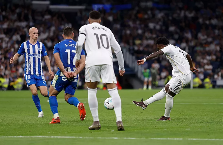 Ese gol espoleó al Real Madrid, que apenas dos minutos después pudo sentenciar cuando Vinicius protagonizó un gran eslalom que culminó con un balón a la frontal para Mbappé. El francés avanzó un par de metros en el área y disparó con fuerza pero esta vez sí, el meta alavesista reaccionó con una buena mano para despejar la pelota.