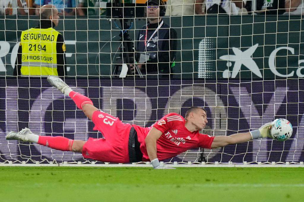 El ucraniano -el mejor del partido para los blancos- se despachó un paradón descomunal junto al palo ante el disparo lejano de Antony en el minuto 44 y, acto seguido, salvó el empate, con una gran intervención en un mano a mano con Bakambú. La jugada continuó y Antony, de nuevo, intentó sorprender a Lunin con un gran disparo desde fuera del área al que respondió el meta ucraniano con otra gran mano.